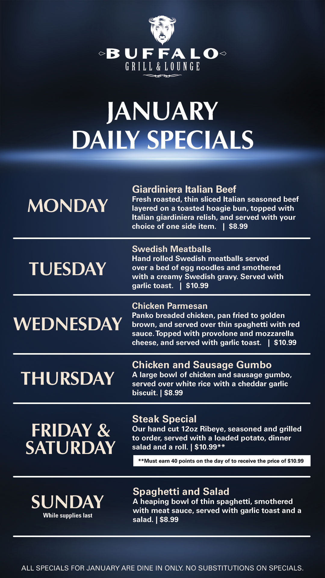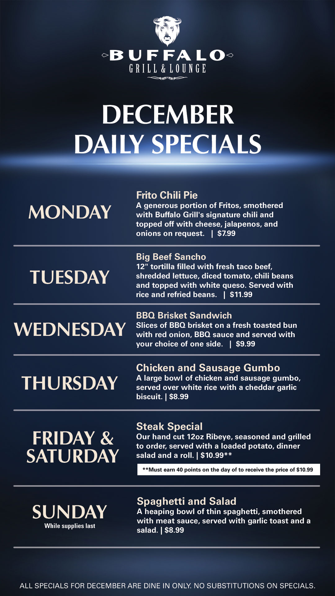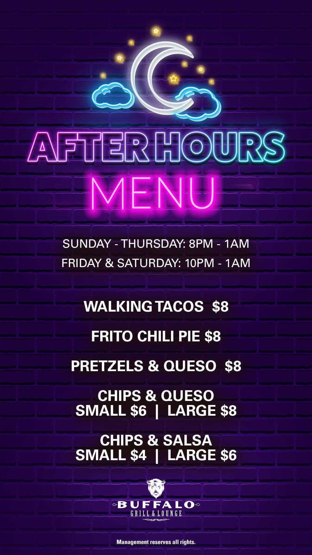 The Buffalo Grill is open 11AM – 8PM, Sunday through Thursday, and until 10PM on Friday and Saturday. Stay up late with us at the Buffalo Lounge, where you can taste one of our Signature Sips, or enjoy premium spirits, beer, wine, seltzers, or a craft brew from Tonkawa Brewery until 2AM daily.